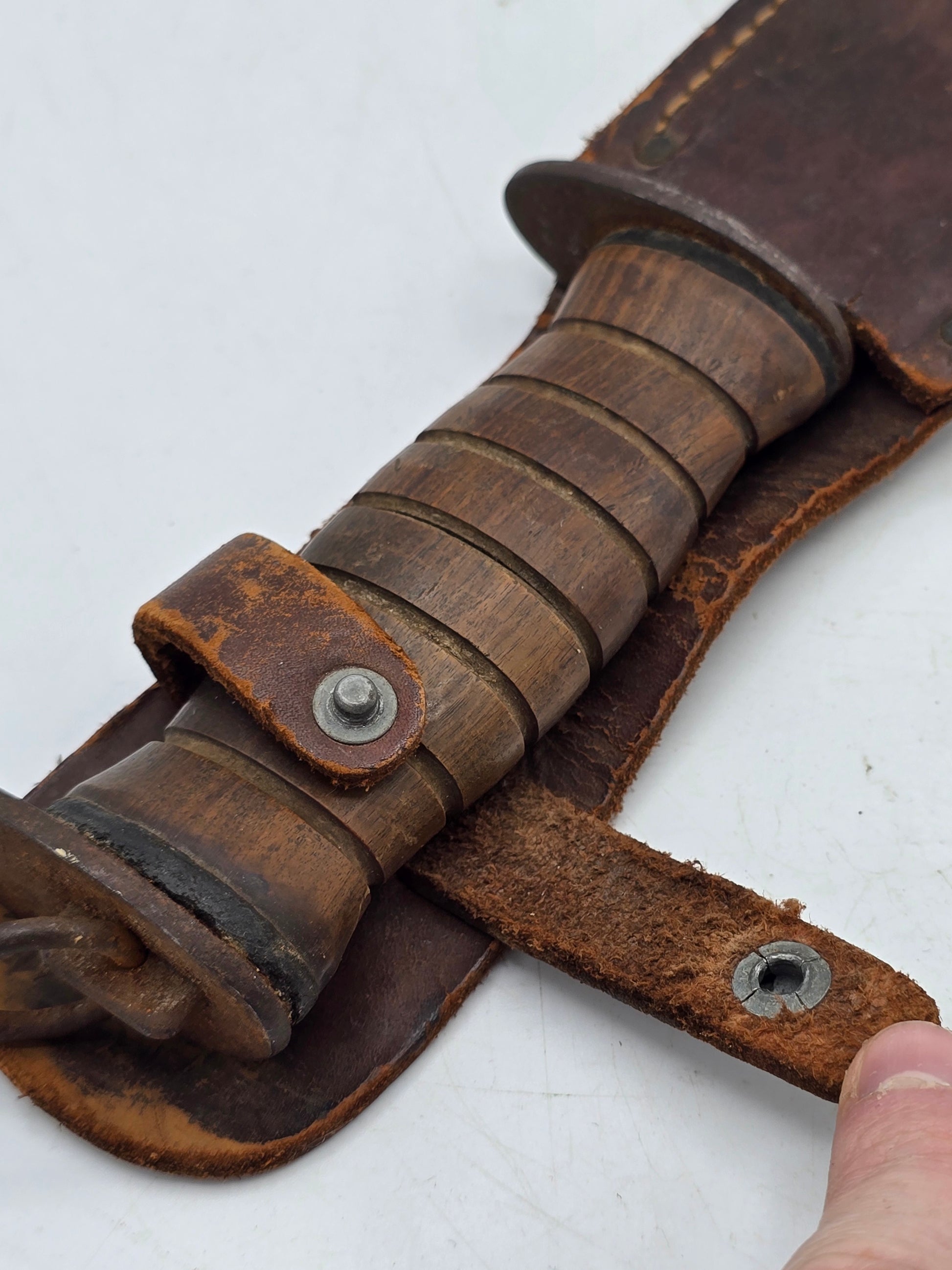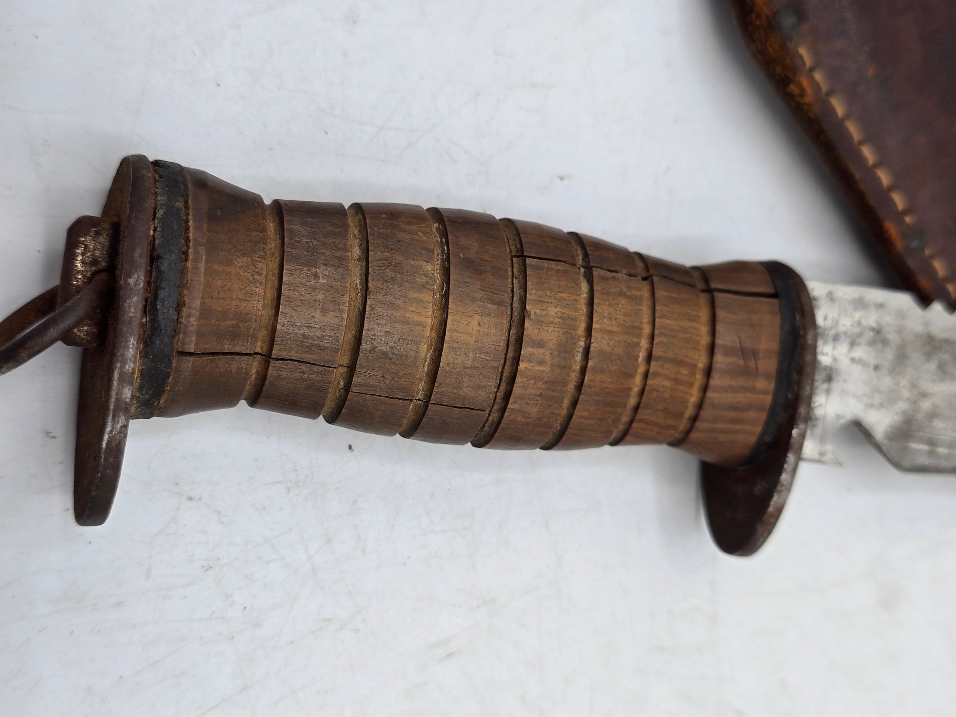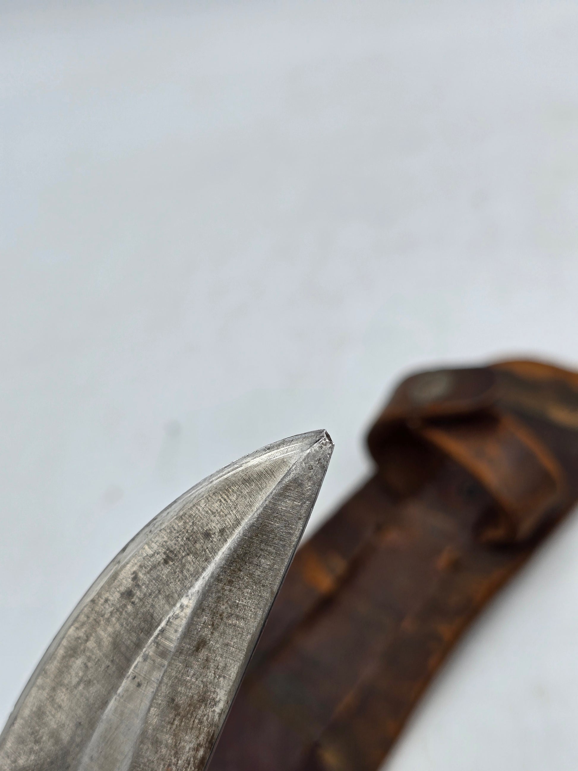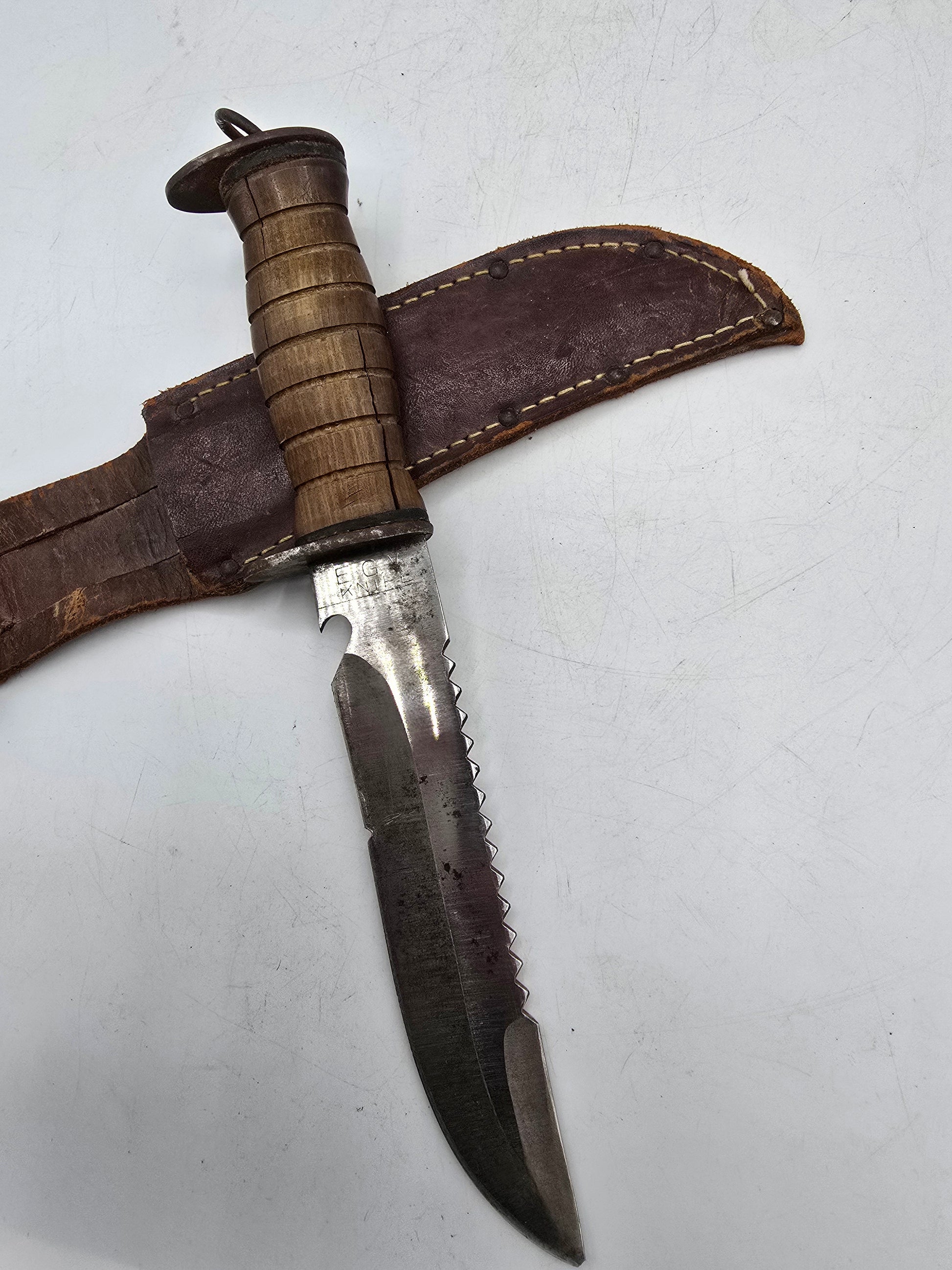 Sympathique poignard US datant de la seconde guerre mondiale EGW. Deux fissures visible dans la poignée bois. Ce tiens bien pour autant. Un accro dans la lame comme visible sur les photos. Pression de l'étuis fonctionnelle.