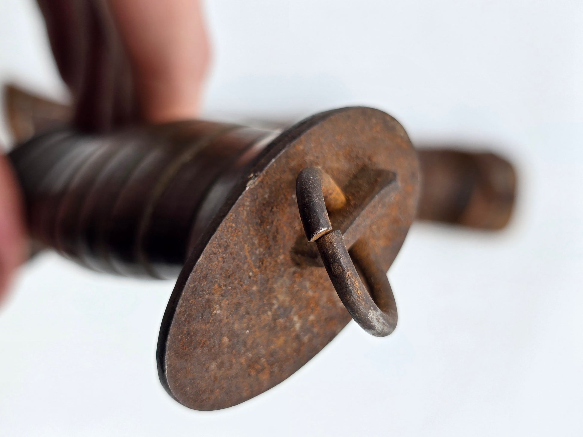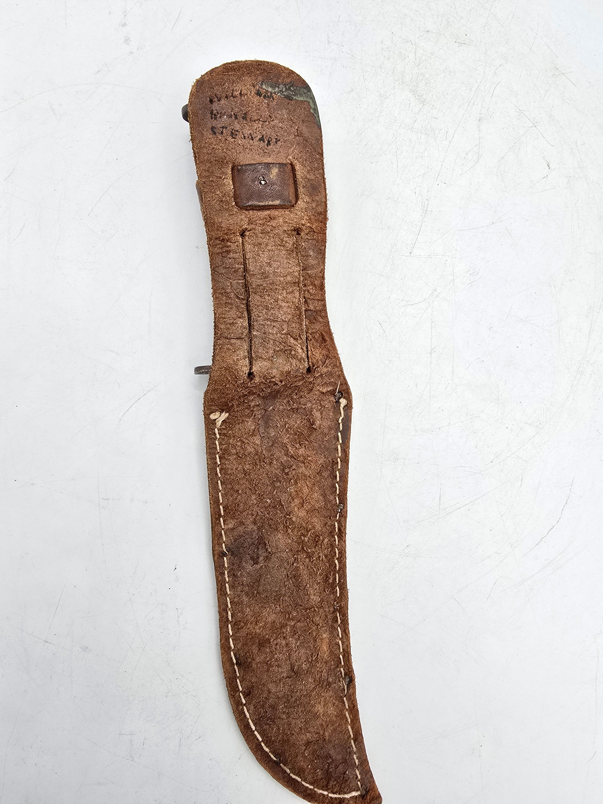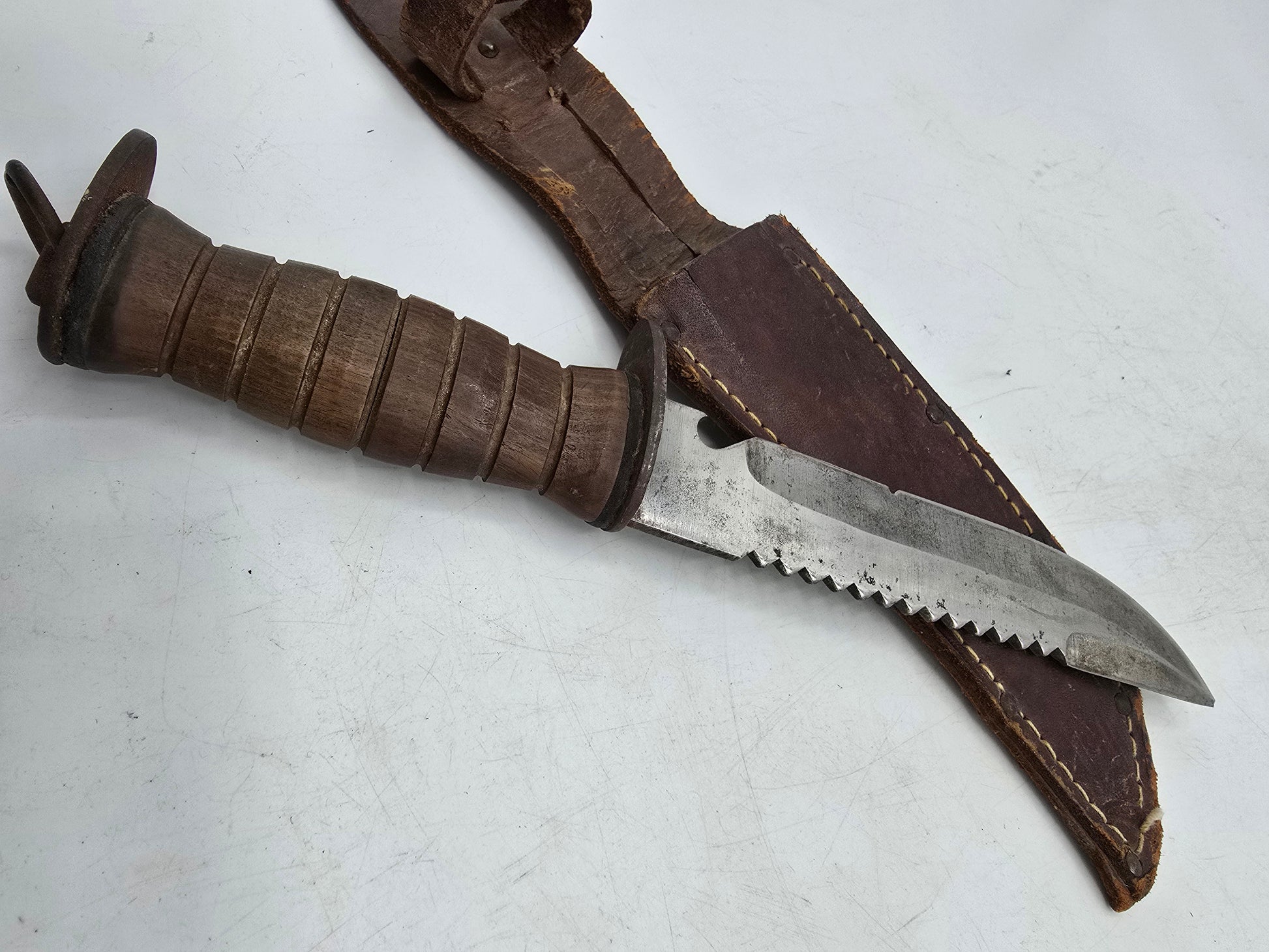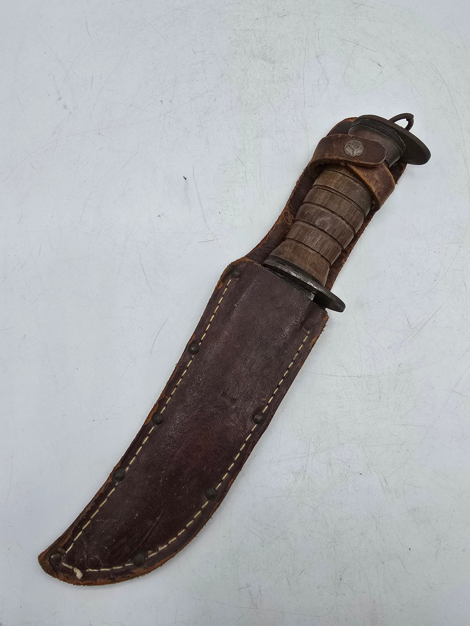Sympathique poignard US datant de la seconde guerre mondiale EGW. Deux fissures visible dans la poignée bois. Ce tiens bien pour autant. Un accro dans la lame comme visible sur les photos. Pression de l'étuis fonctionnelle.