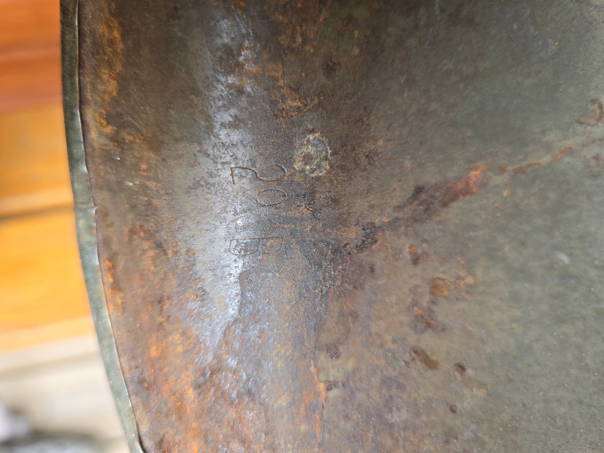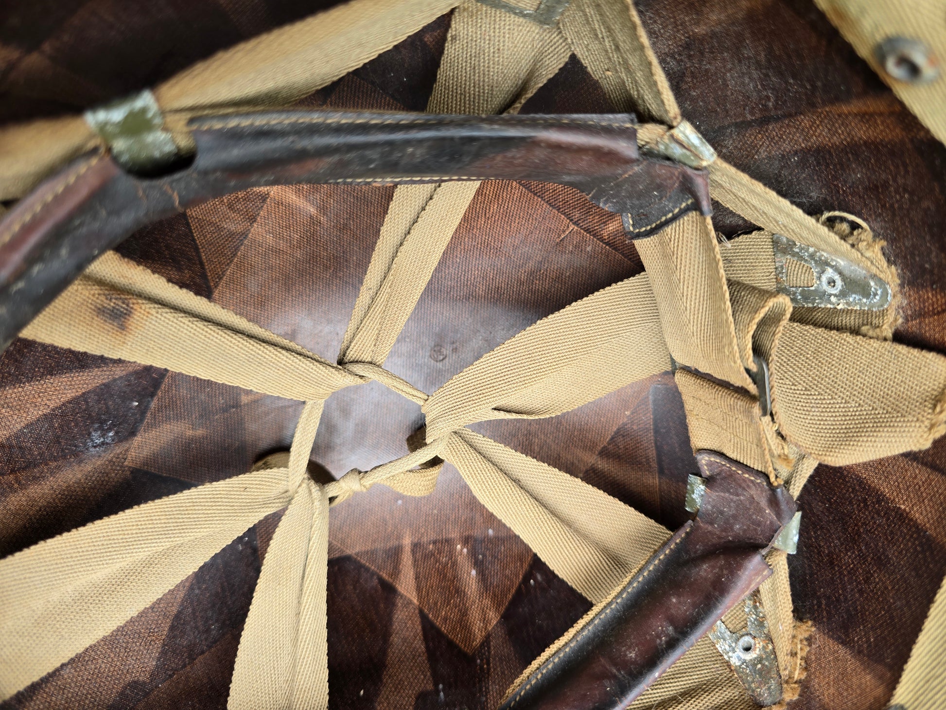 Casque US M1 pattes fixes d'usine modifié en mobile avec liner Westinghouse. Coque US M1 McCord 290B ( sortie d'usine en pattes fixes. Repassée en pattes mobiles en 1944 ) jugulaire OD7 avec boucle mâle modèle T1. Liner Westinghouse A Washer peint en vert. Cuir du sweatband assez sec. Véritable ensemble.