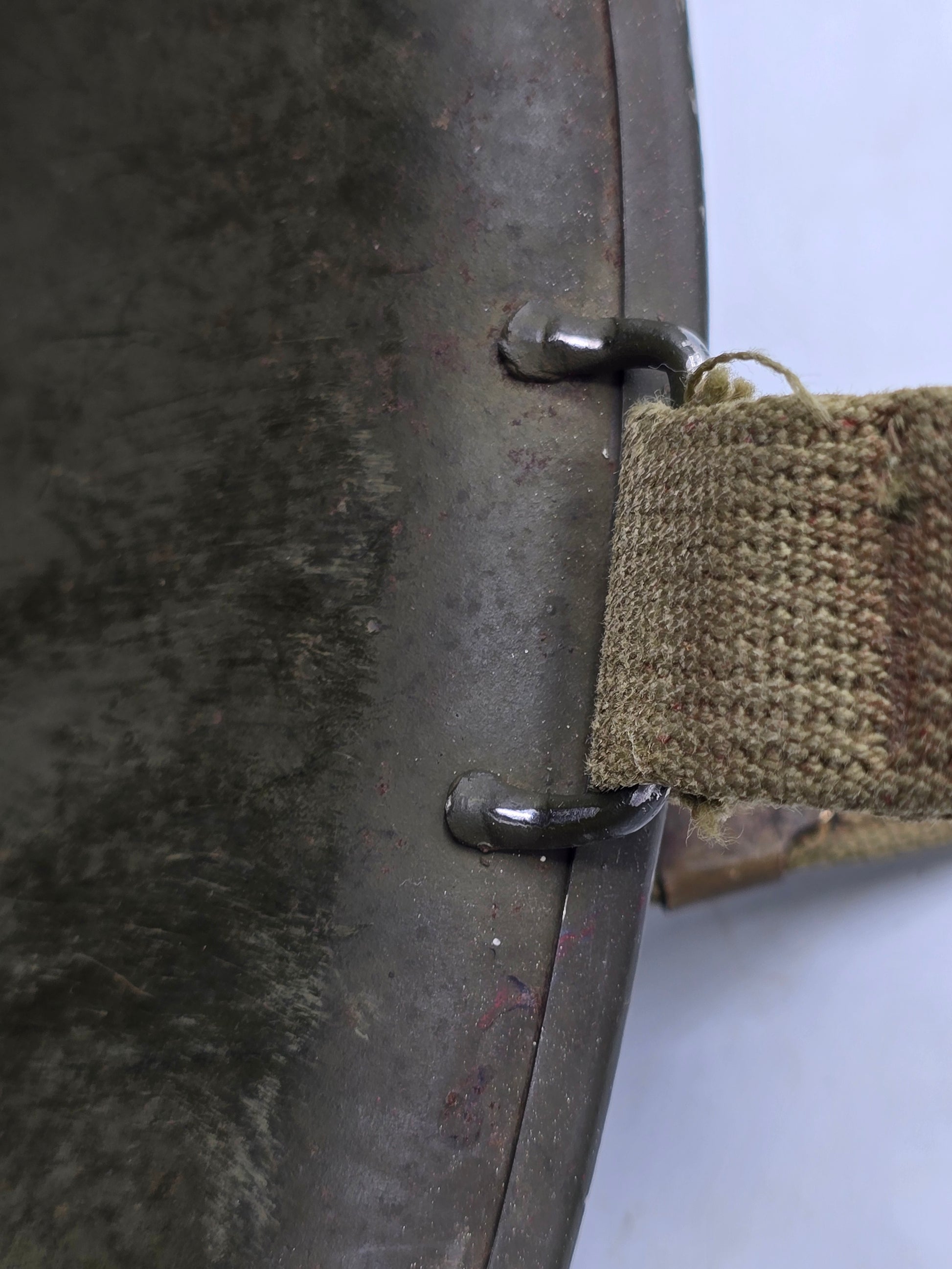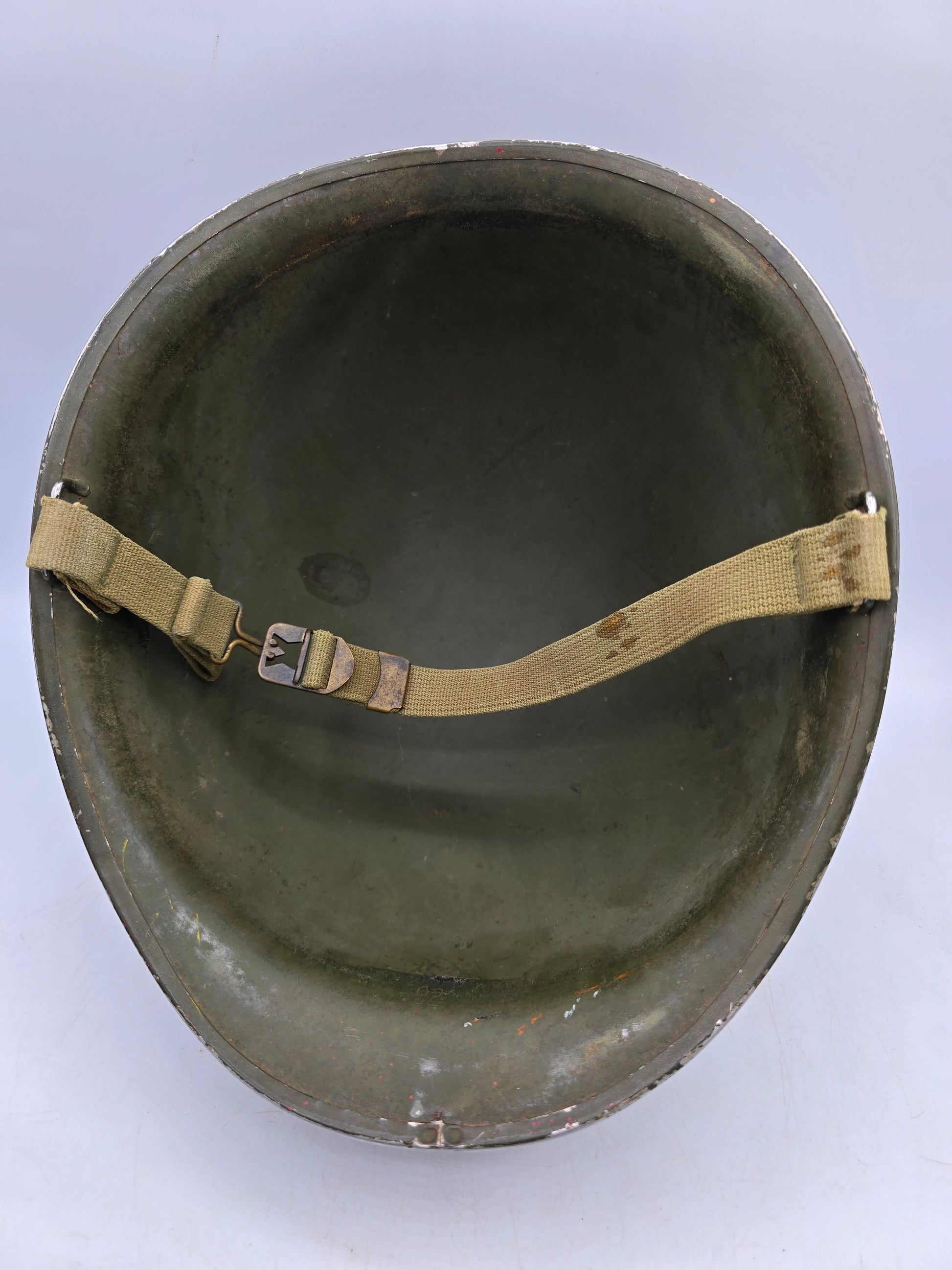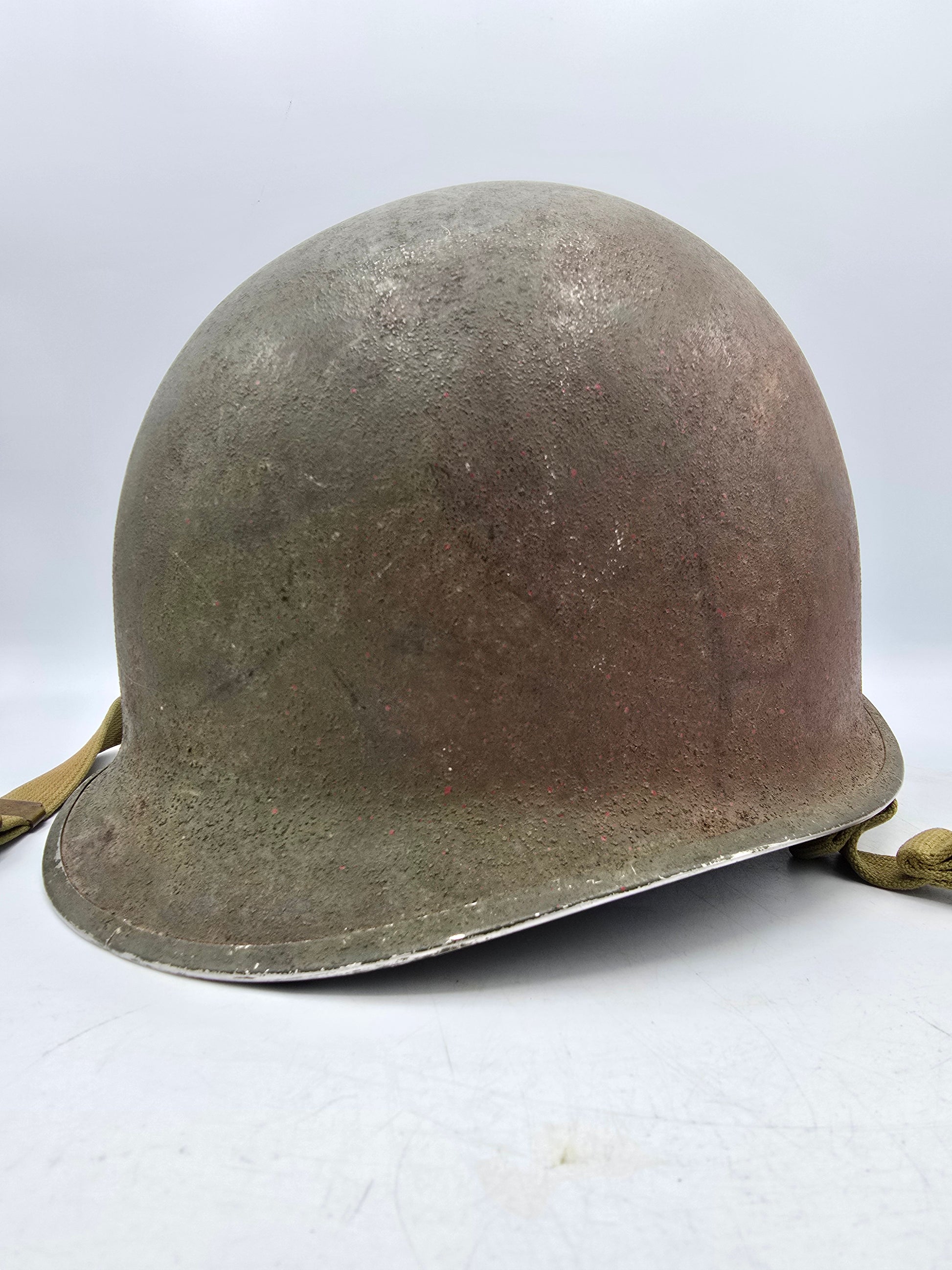 Superbe coque de casque de l'armée américaine lors de la seconde guerre mondiale. Fabrication précoce lot 92C. Jug monté d'origine. Très belle coque. Légère projection de peinture rouge sur le côté gauche. À nettoyer ou non.