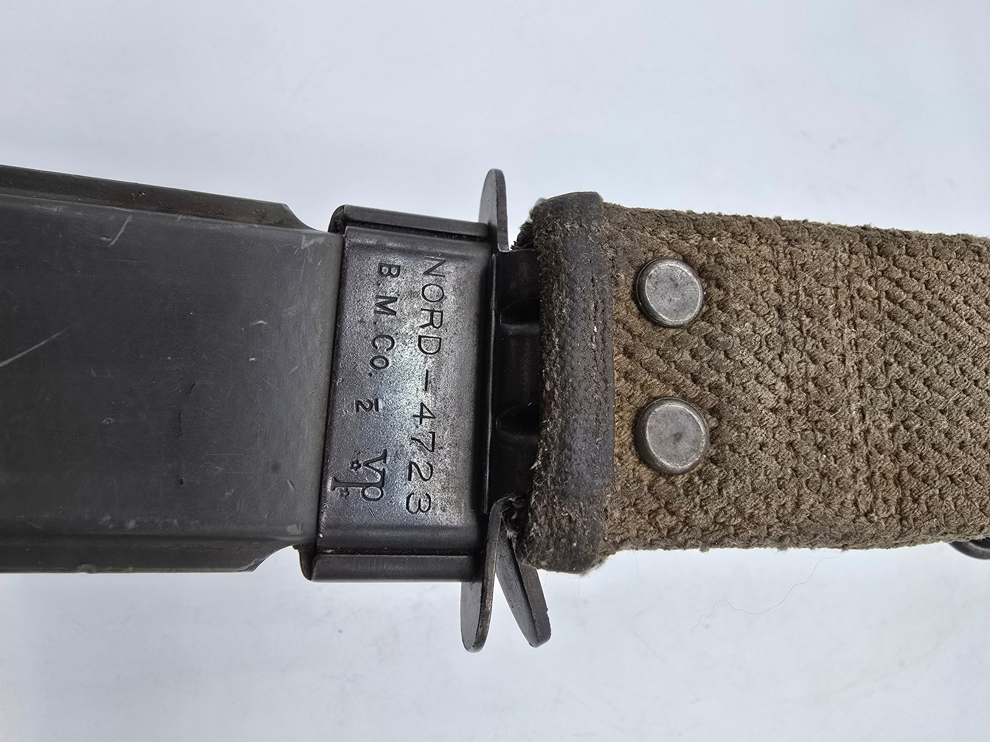 Poignard US Navy Mark2 etuis Nord 4723. Le poignard est du marquage lame Robeson Shuredge. Belle état. Pression fonctionnelle. Trou de la sangle en bas de l'étuis agrandie.