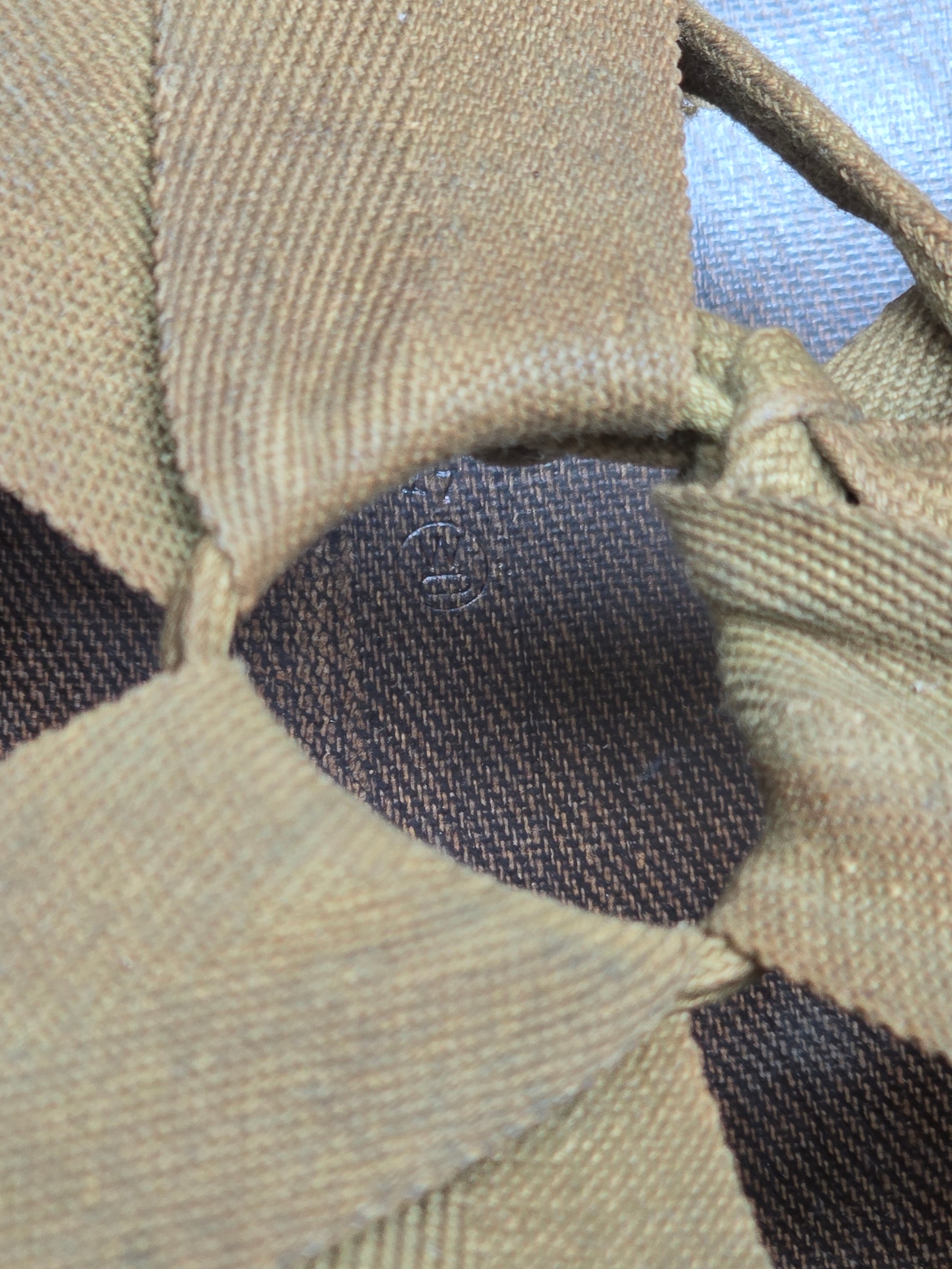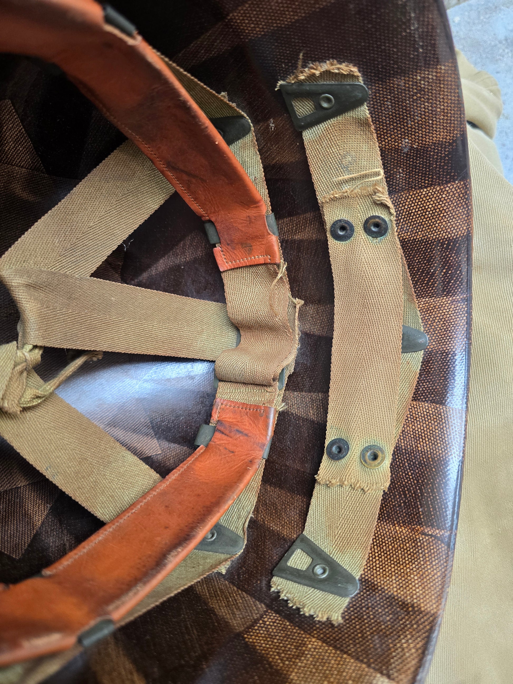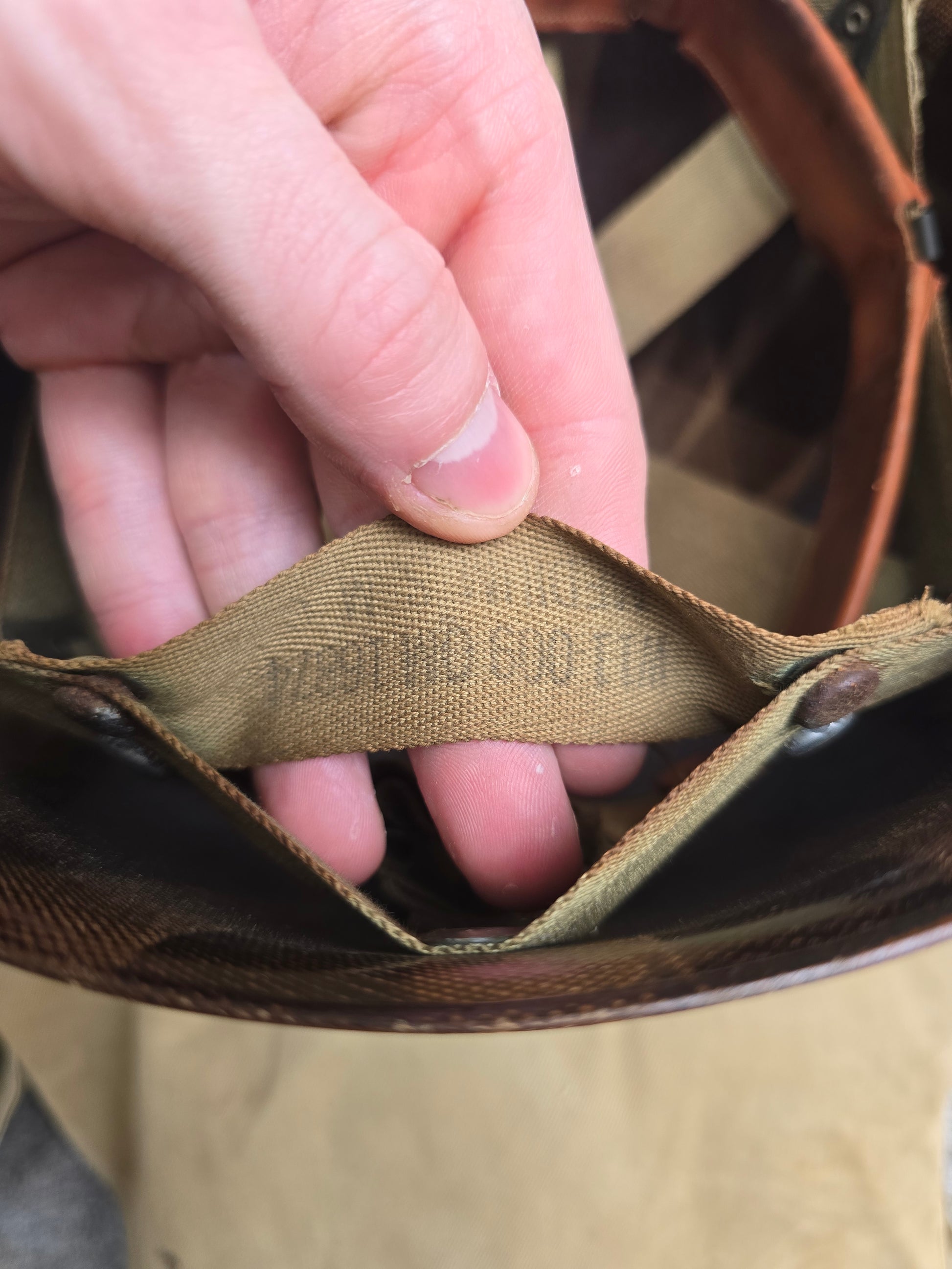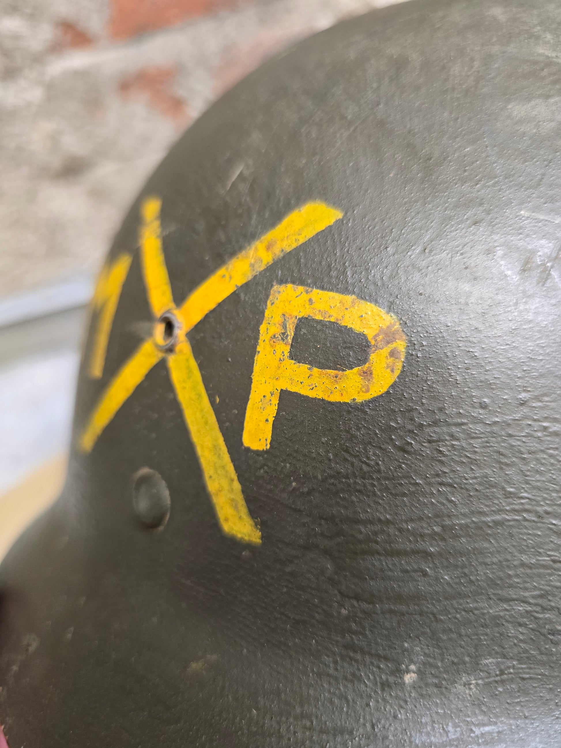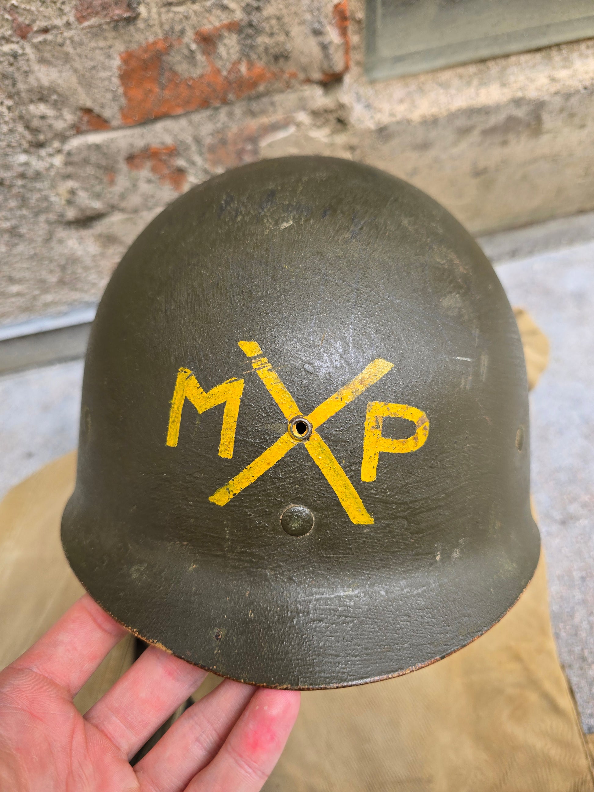 Magnifique sous casque US M1 de MP en jaune. Croix signification inconnu. Marquages au crayon de papier sur le dessus.